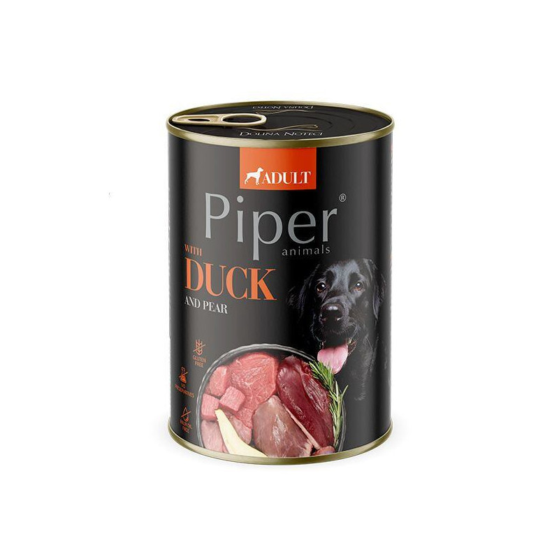 Složení: maso a produkty živočišného původu 65 % (z toho 10 % hovězí, 10 % vepřové, 10 % kachní filet, 3% kuřecí žaludky, 3 % vepřové srdce), vývar, ovoce (hruška 4%), obiloviny ( přírodní hnědá rýže 4%), minerální látky, oleje a tuky (lněný olej 0,2 %), sušený rozmarýn 0,01 %