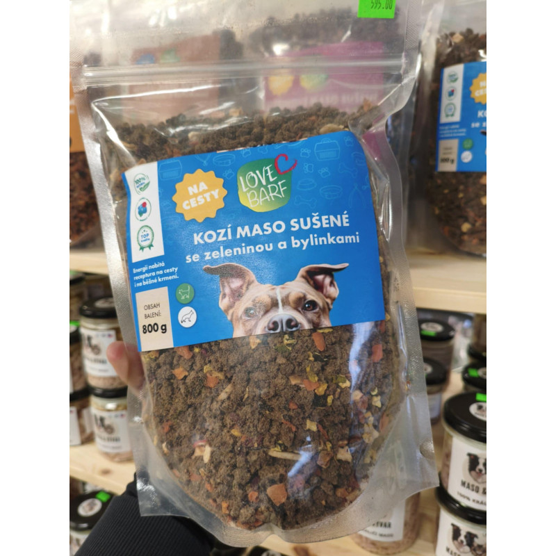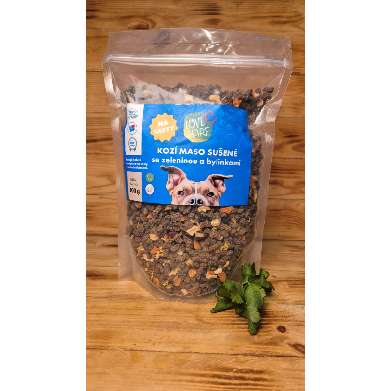 Složení: 80 % sušené kozí maso, 3 % jablko, 3 % mrkev, 3 % červená řepa, 3 % cuketa, 3 % dýně, 1,67 % banán, 1,67 % šípek, 1,66 % černý rybíz